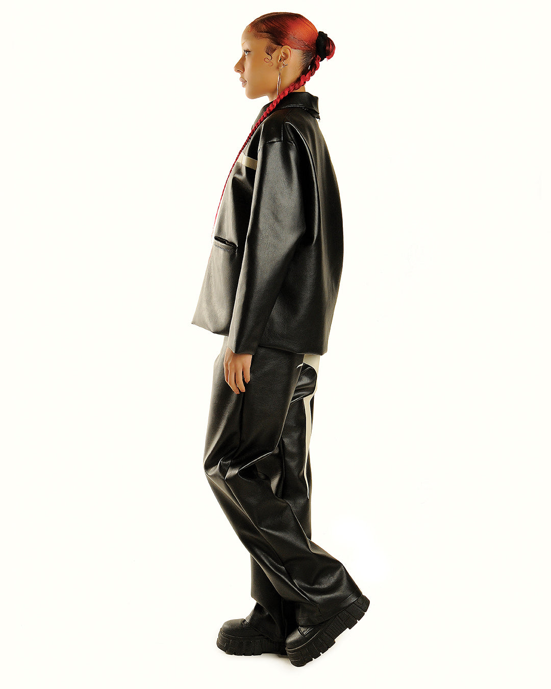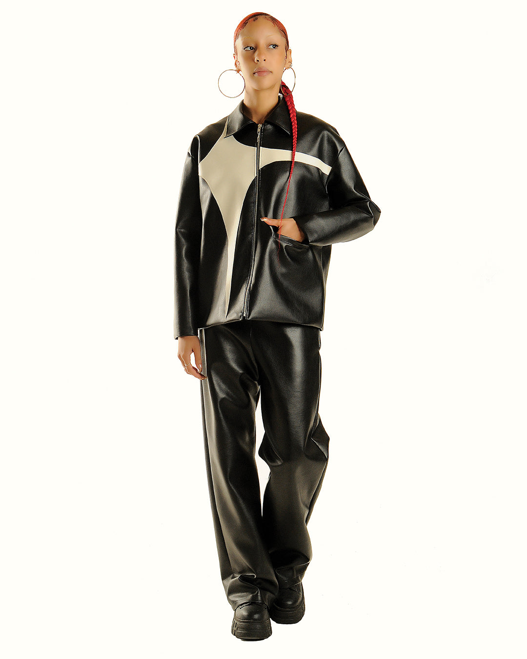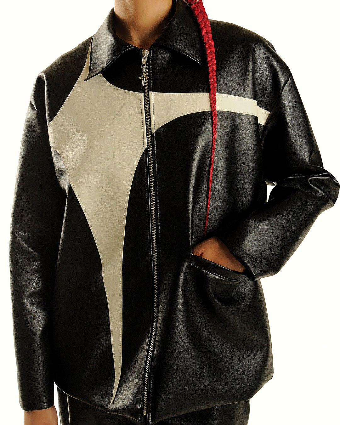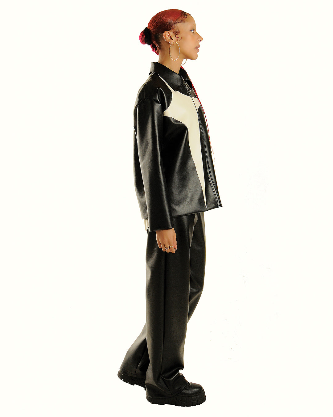 Faux leather collared coach jacket with contrast cream star appliqué and side jet pocket. Fully lined with signature silver star charm zip.