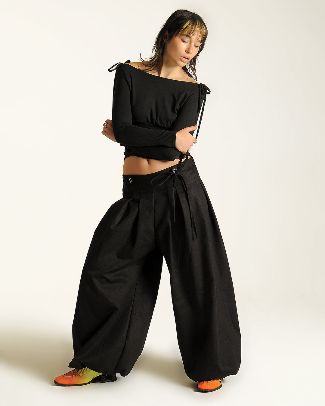 Soft touch slinky jersey with polka flock mesh body, shoulder ties can make the neckline more/less off the shoulder.