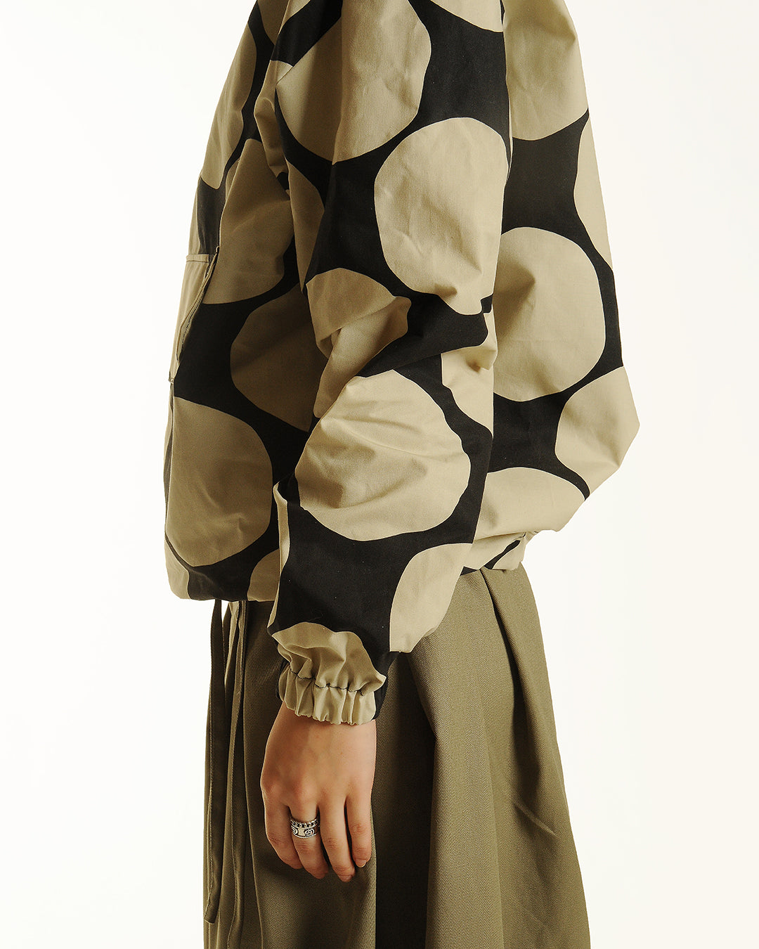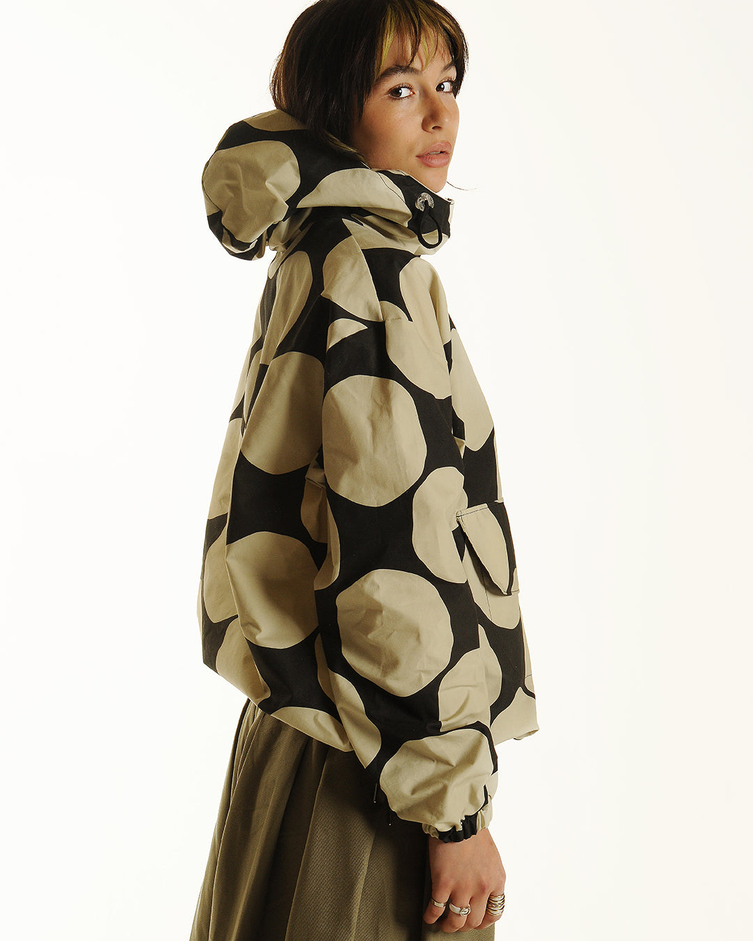 Showerproof polka printed pullover, high neck velcro hood with adjustable toggle ties. Hem has adjustable ties for a boxy or cinched look. YKK zip with signature star detailing large front flap pocket.